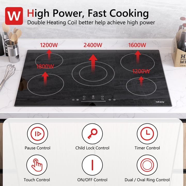 IsEasy 30-Inch 5-Burner Electric Ceramic Cooktop, Built-in Black Glass Stove with Touch Controls, Timer, Child Lock, 9 Power Levels, Energy Efficient, 220-240V