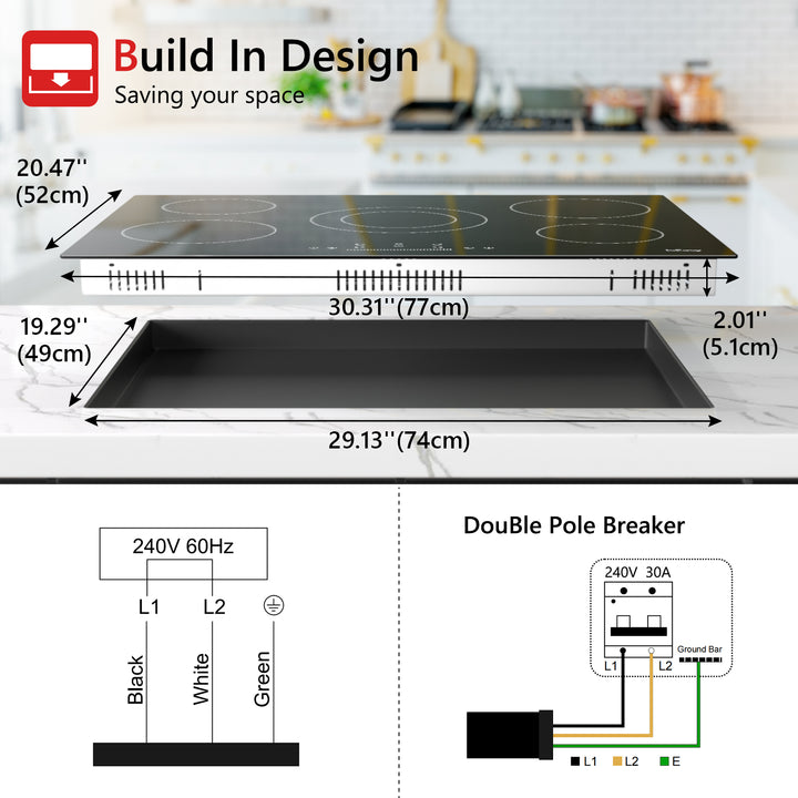 • 30" electric cooktop size(WxDxH): 30.3"X 20.5" X 2.1"