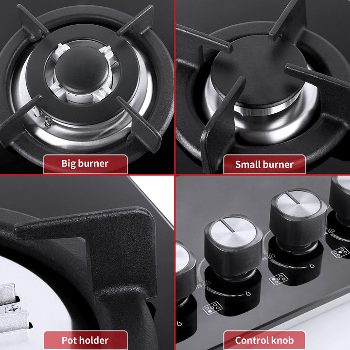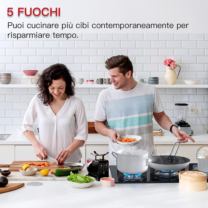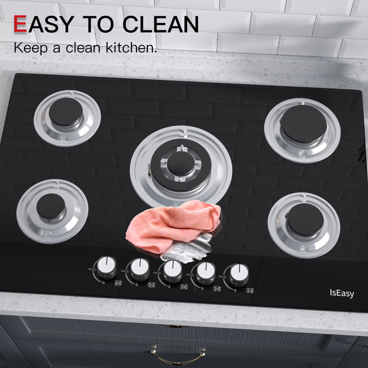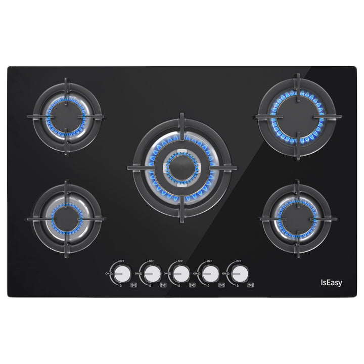 IsEasy 30" Glass Gas Hob, 5 Burners, Built-in, NG/Propane Convertible, Up to 10.5 kW, 5 Zones, Black Glass